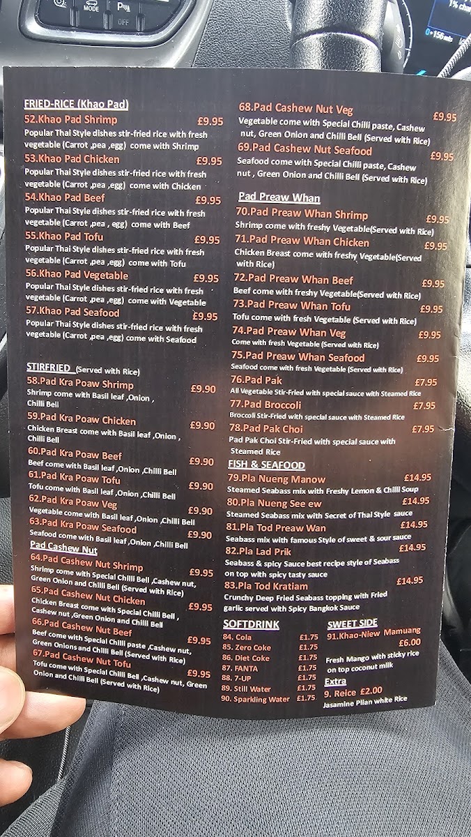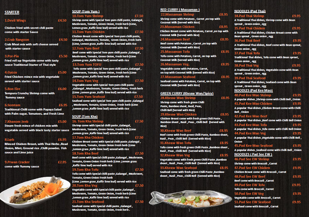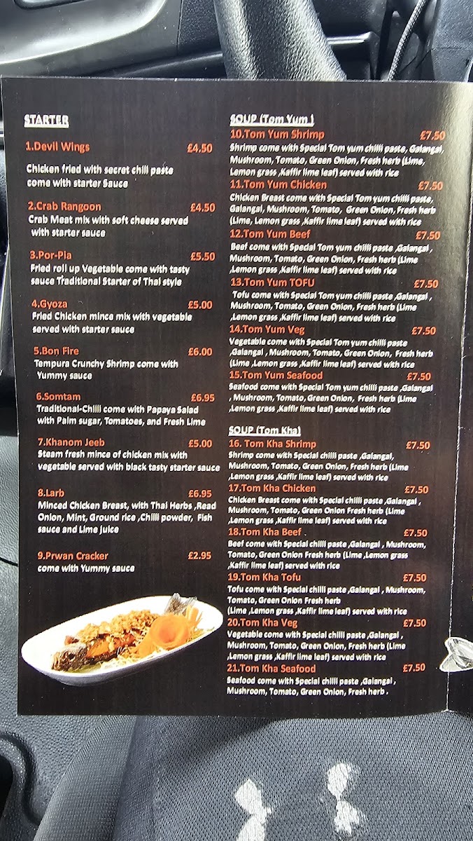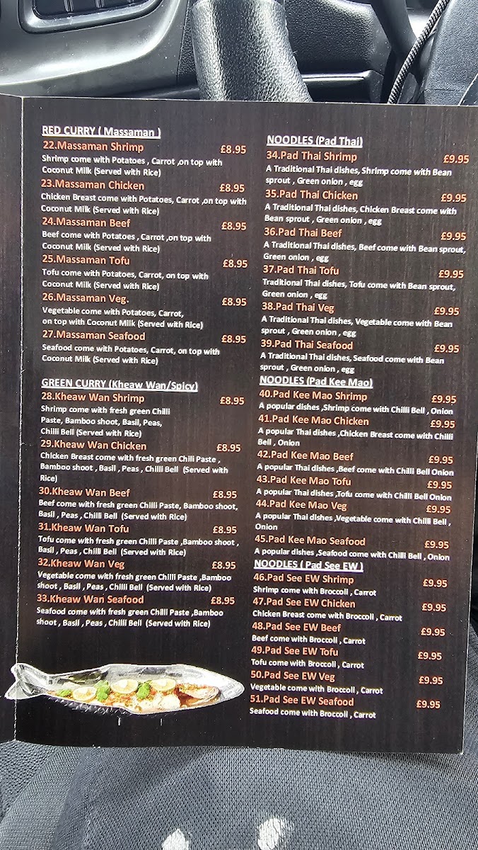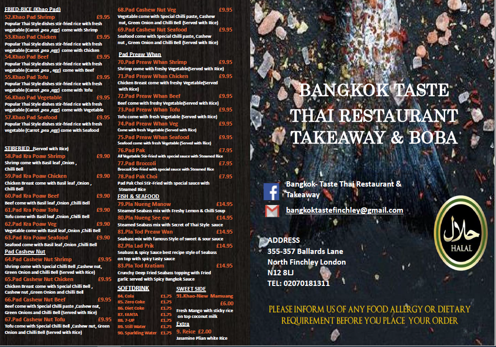 The menu at Bangkok Taste Thai Restaurant offers a diverse range of dishes that beautifully capture the essence of Thai cuisine. For starters, you can choose from Devil Wings, Crab Rangoon, Por-Pia, Gyoza, and the unique Bon Fire. Moving to the soups, options like Tom Kha Shrimp, Tom Kha Chicken, Tom Kha Beef, Tom Kha Tofu, and Tom Kha Veg are available, each with its own rich and aromatic flavors. The red and green curry sections feature classics such as Massaman Shrimp, Massaman Chicken, and Massaman Beef, alongside vegetarian alternatives like Massaman Tofu and Massaman Veg. Similarly, the Kheaw Wan Shrimp, Kheaw Wan Chicken, and Kheaw Wan Beef curries offer a delightful selection for curry lovers. If you're craving noodles, try the popular Pad Thai Shrimp, Pad Thai Chicken, and Pad Thai Beef, or the vegetarian-friendly Pad Thai Tofu and Pad Thai Veg. The fried rice section includes the flavorful Khao Pad Shrimp, Khao Pad Chicken, and Khao Pad Beef, along with vegetarian options. For stir-fries, Pad Kra Poaw Shrimp, Pad Kra Poaw Chicken, and Pad Kra Poaw Beef are must-tries, with veggie options also on the menu. Seafood enthusiasts can indulge in dishes like Pla Nueng Manow, Pla Nueng See Ew, and Pla Tod Preaw Wan. To refresh, a variety of soft drinks like Cola, Zero Coke, Diet Coke, Fanta, and 7-Up are available. Lastly, treat yourself to a sweet ending with Khao-Niew Mamuang. Whether you're a fan of classic Thai flavors or something more adventurous, Bangkok Taste offers an exciting and comprehensive menu that caters to all tastes.